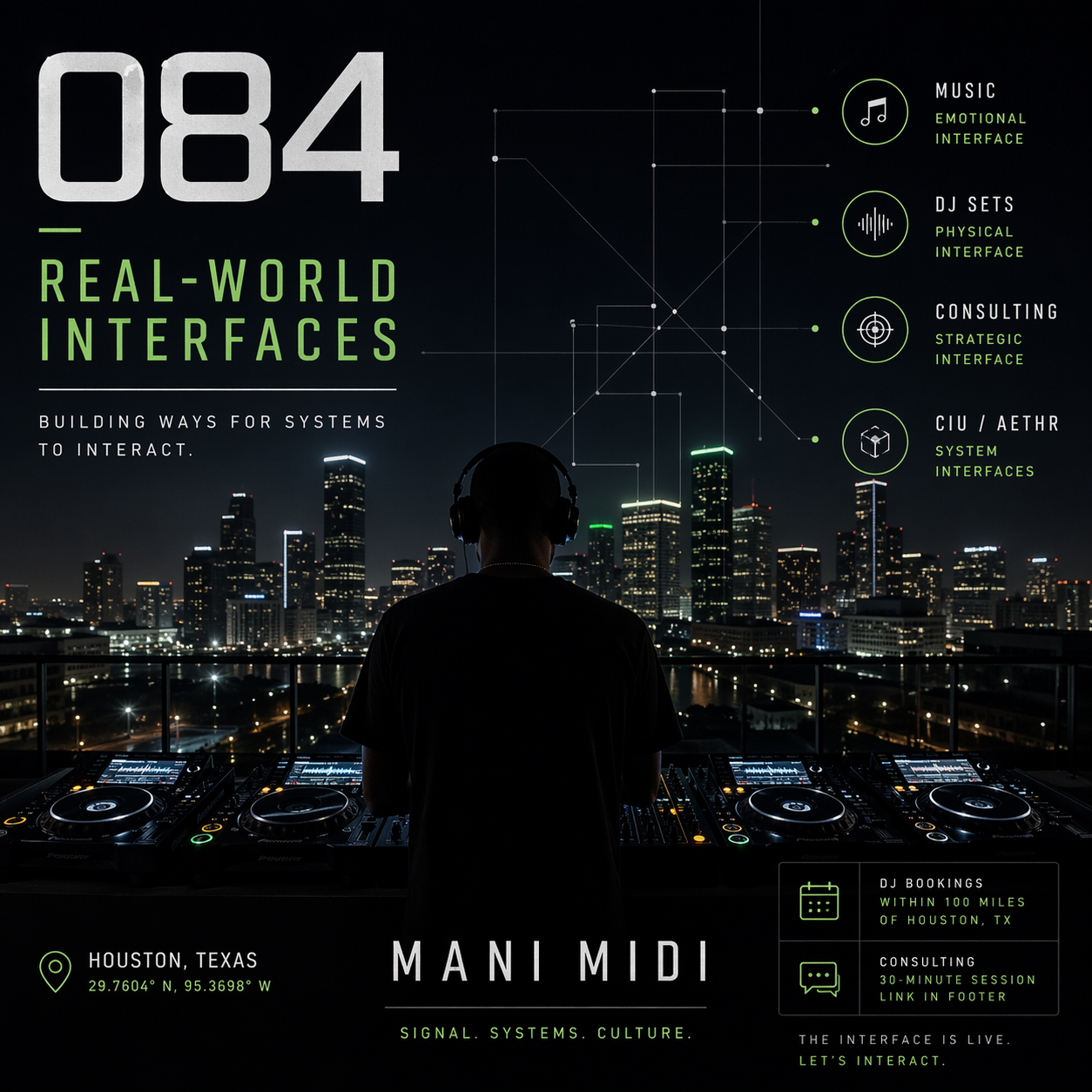 If you have been following the work, this is where it becomes accessible. I am currently open for DJ bookings within 100 miles of Houston, and available for consulting through the 30-minute session linked in the footer. Whether it is music, strategy, or systems, the interface is now live.